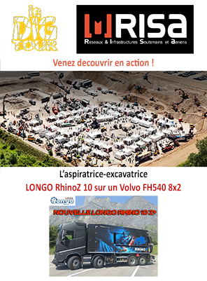 Montée sur un châssis Volvo FH540 8x2. La société RISA, distributeur Longo France, sera présente au Dig Tour à Bruay-la-Buissière ce jeudi 12 et vendredi 13 juin. Venez pour essayer cette aspiratrice et d'autres machines !
